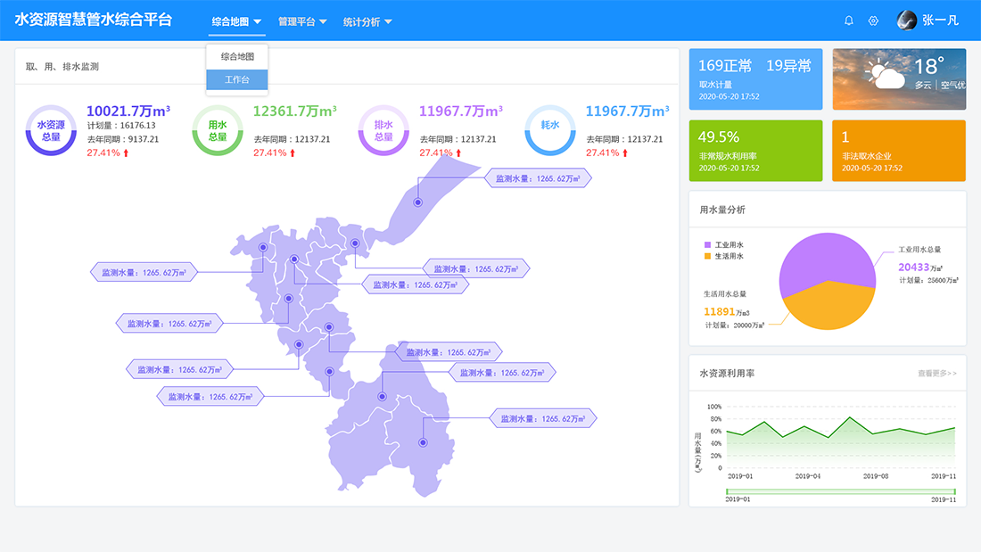 平臺以數字化手段變革水資源管理方式,通過多部門協同、深層細化管水維度,實現水資源用水總量控制以及生活、工業、農業分場景用水控制。全力提升算力,構建管網異常監測模型,管網漏損預警模型、流程重塑模型等研判手段,致力提升水資源節水及管水效率。